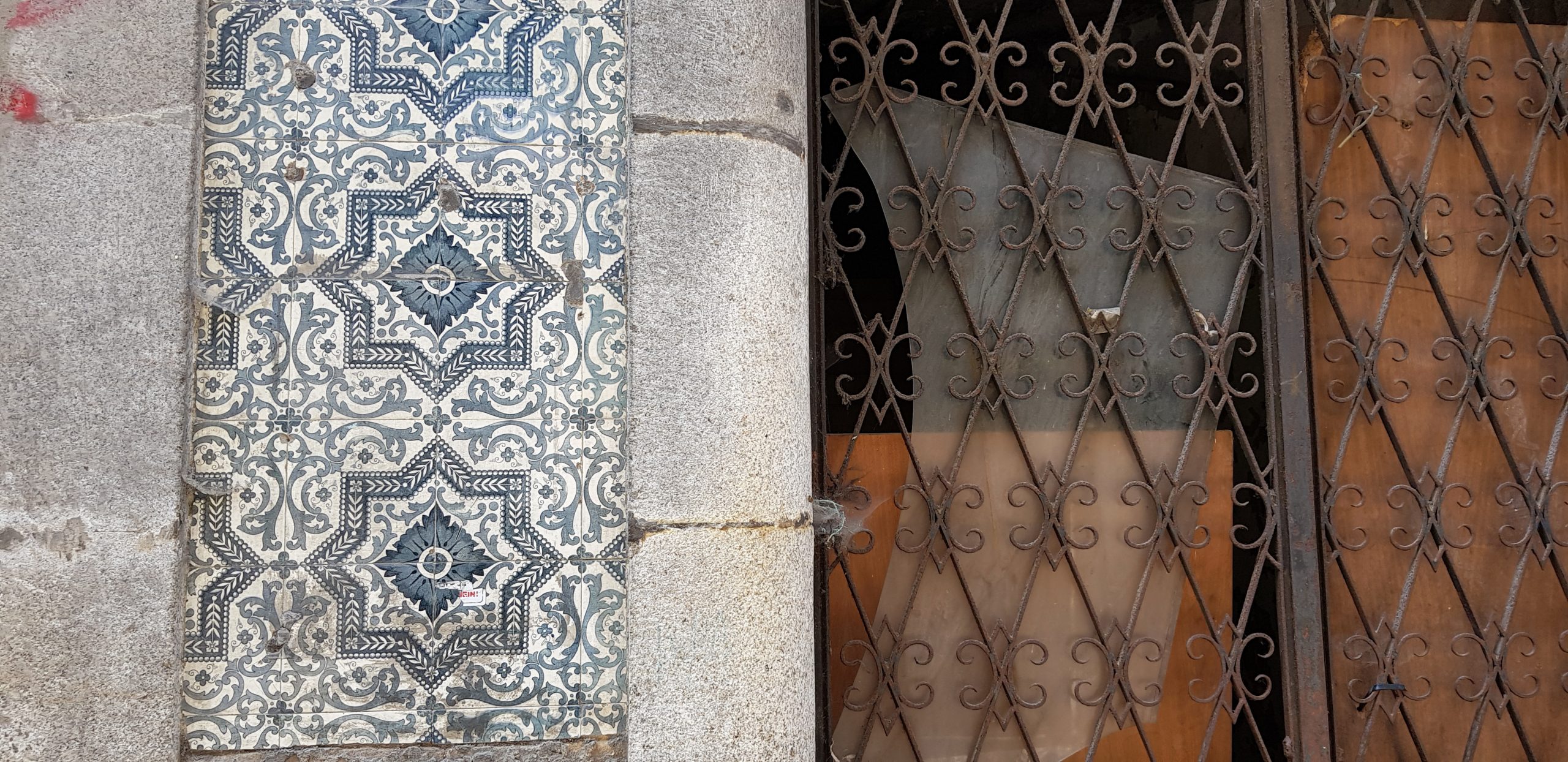 Categorias: azulejo, caótico, contrastante, decadente, enquadramento, fachadas, ferro (metal), forma, geométrico, gramática, matéria, padrão, pedra, plano aproximado, portas, qualificantes, ritmo, sobreposição, textura, vidro